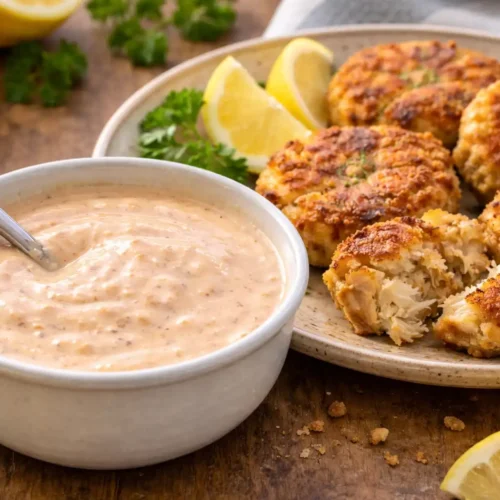 This sauce pairs best with classic pan-fried crab cakes, baked crab cakes, or air-fried versions. Its creamy, tangy profile balances the crisp exterior and enhances the natural sweetness of the crab without overpowering it.